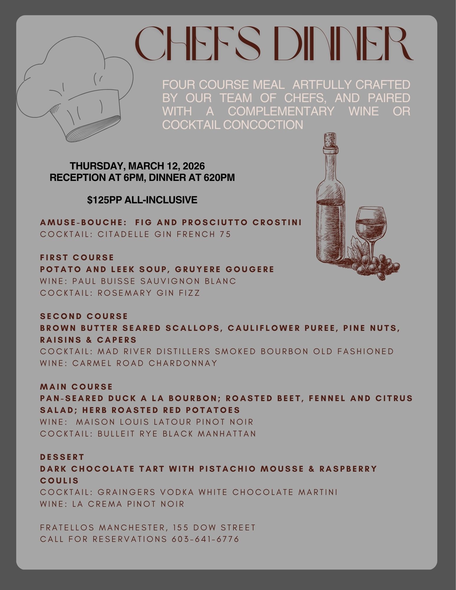Join us for our Chefs Dinner, Thursday March 12th.